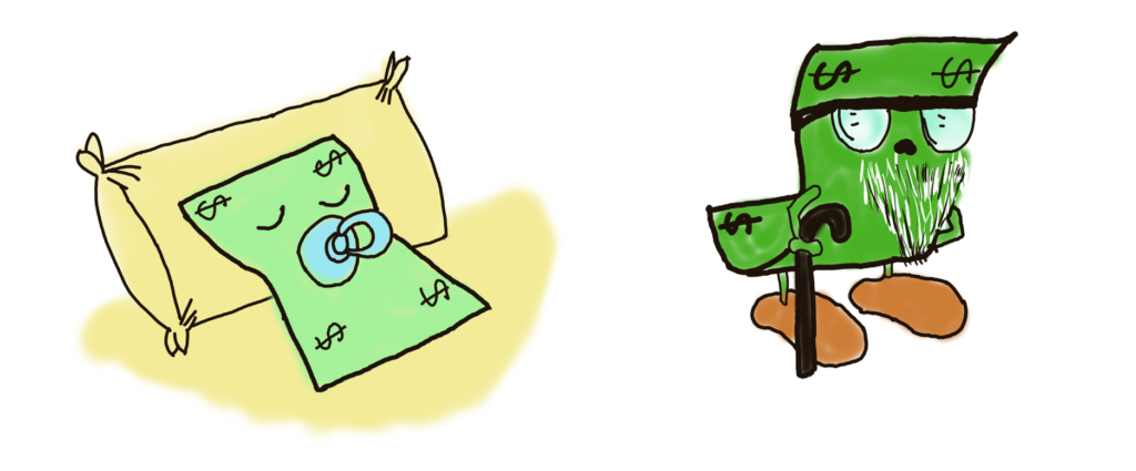 In nature, everything is born, grows, and dies – it’s a universal rule. With money, this doesn’t seem to work because money is born and from then on begins to lose value (wither). How so? – The money you received today already starts to lose value tomorrow, until it’s worth very little (money loses purchasing power, that is, it’s worth less). To avoid this, you should learn to invest, thus ensuring that it loses less value or even multiplies.
